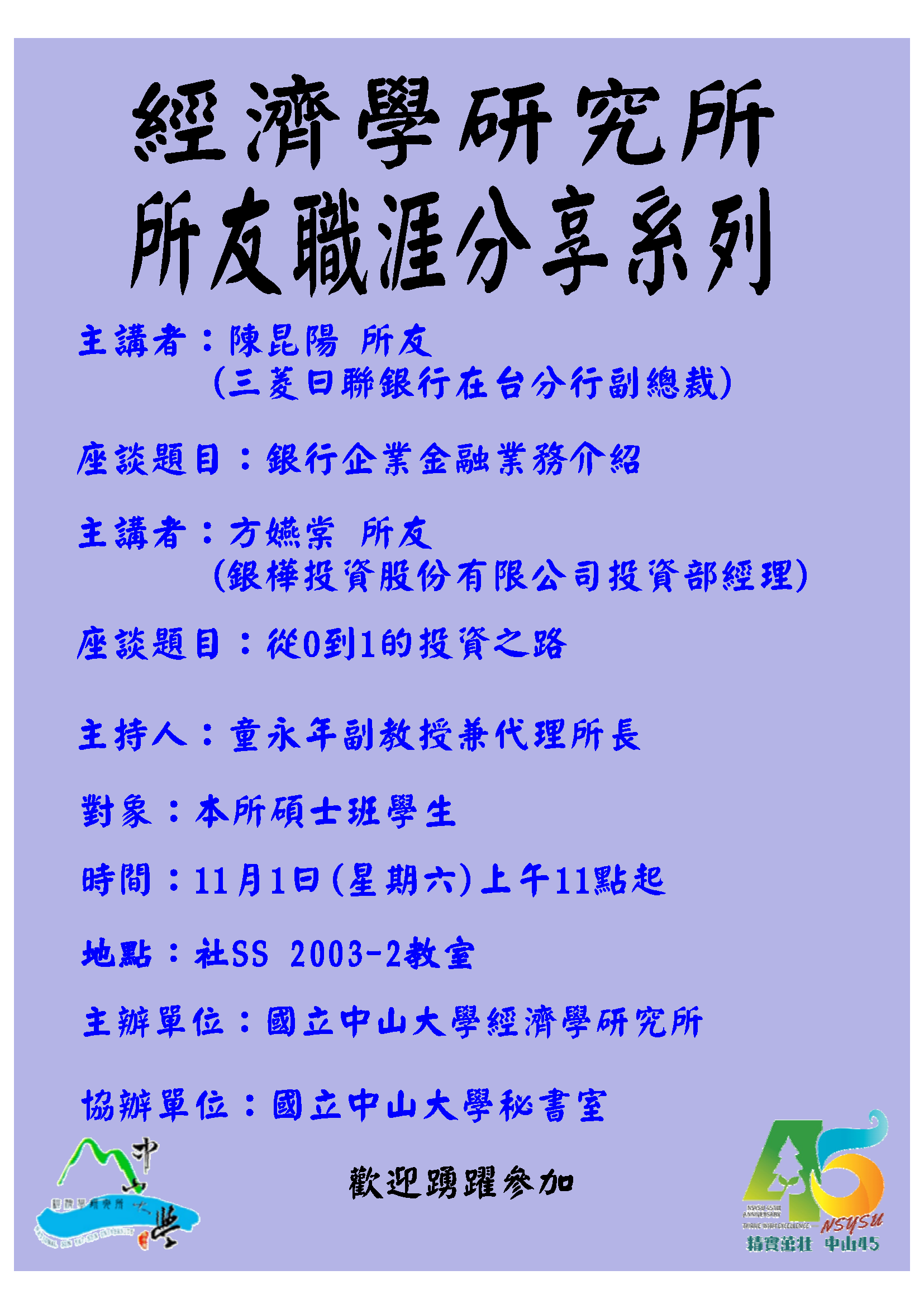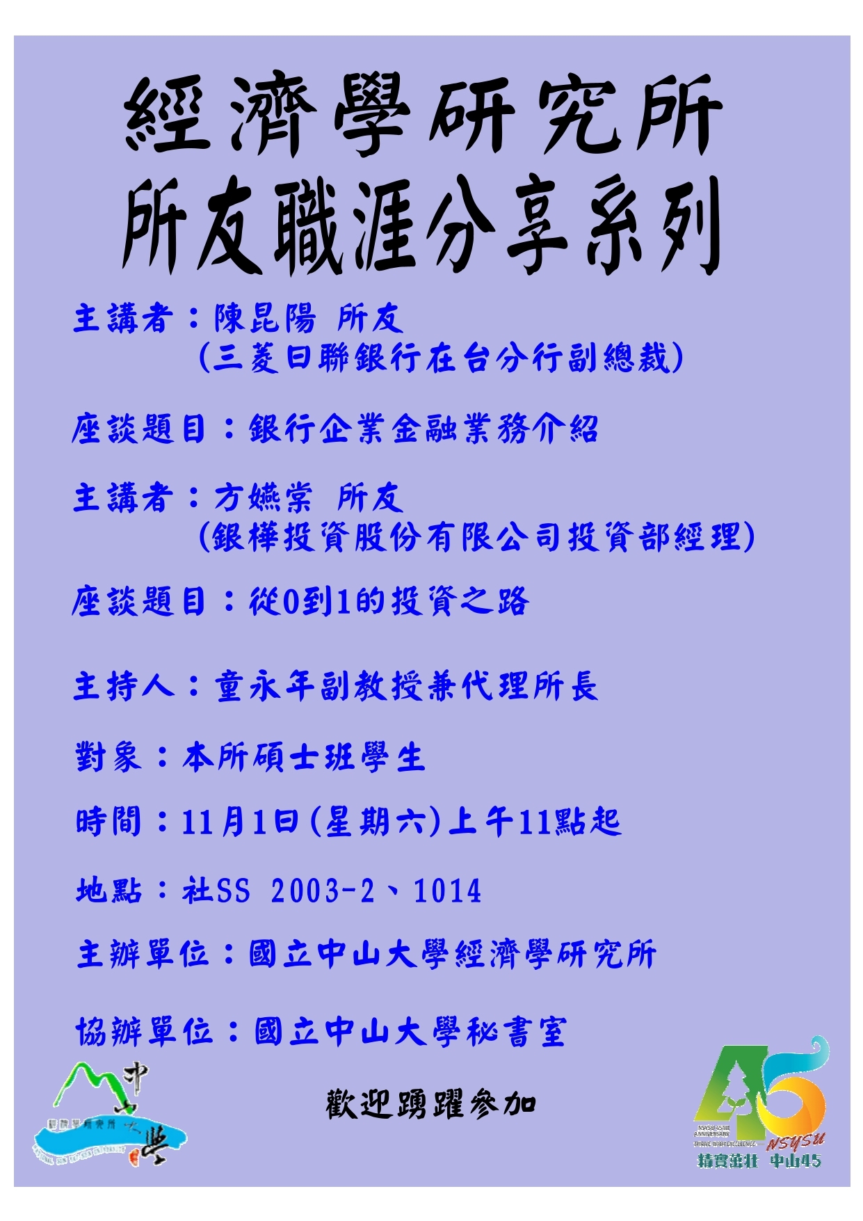【公告】11/01 邀請三菱日聯銀行在台分行 陳昆陽 副總裁 及 銀樺投資股份有限公司 方嬿棠 投資部經理 職涯分享