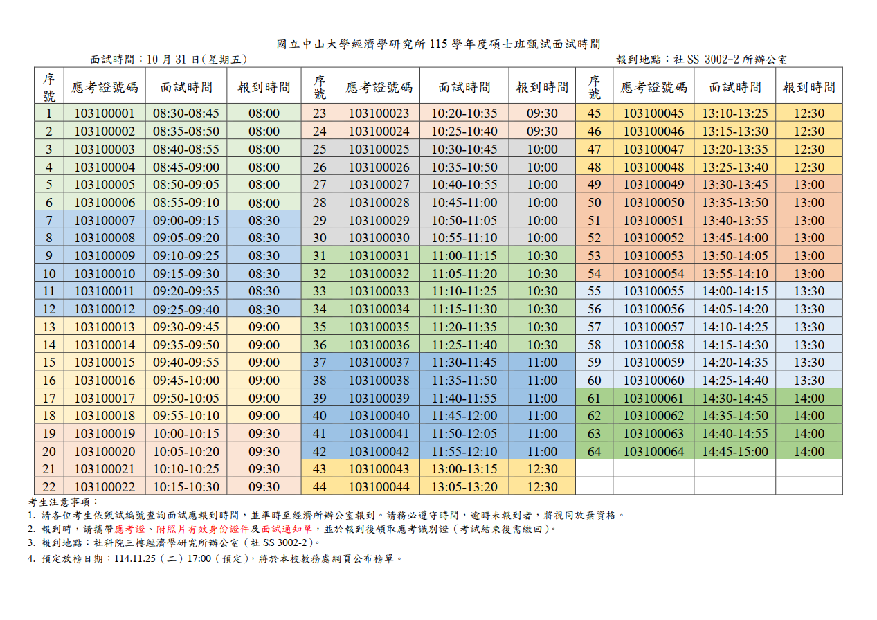 國立中山大學經濟學研究所115學年度碩士班甄試面試時間